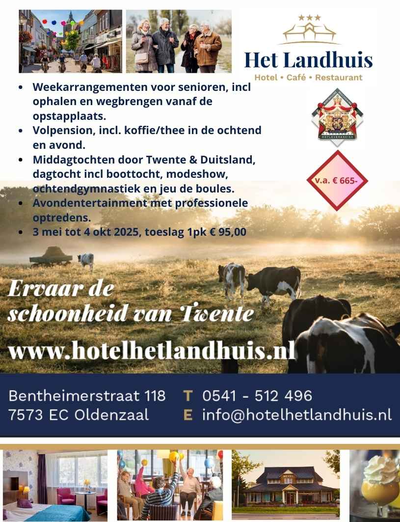 Graag nodigen wij u uit in ons mooie familiehotel in Twente. Tussen april en oktober ontvangen wij wekelijks 35 – 50 gasten voor een weekje vakantie. Vele mensen komen ons hotel al jarenlang achtereen bezoeken. U kunt met een groep, maar ook particulier, met partner, familie of vrienden, en zelfs alleen een weekje bij ons te gast zijn. Met trots presenteren wij het arrangement van 2025: